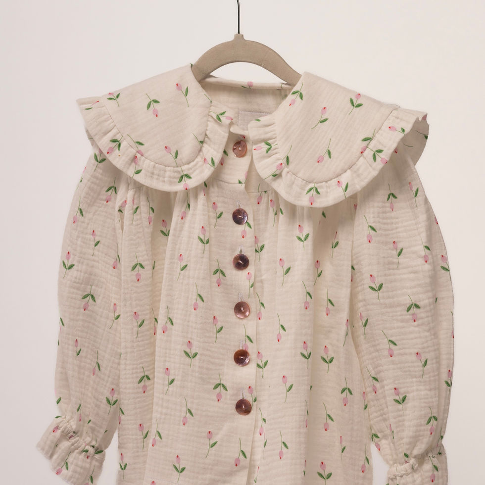 - Tissu léger en coton blanc avec des petites roses, des boutons en acres roses, un tissu soyeux et délicat